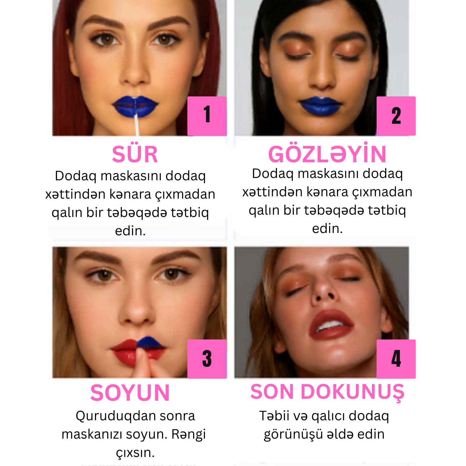 Sadəcə dodaqlara sürtün, qurumasını gözləyin və sonradan nazik təbəqəni soyun – canlı rəng dodaqlarınızda qalacaq.